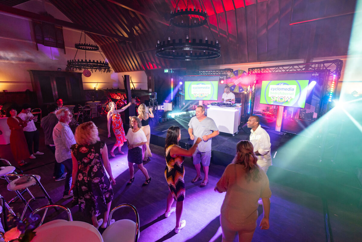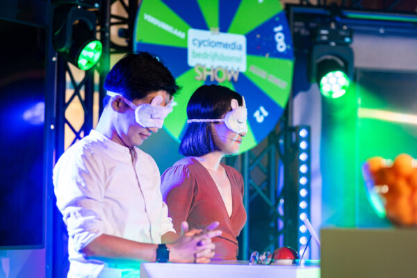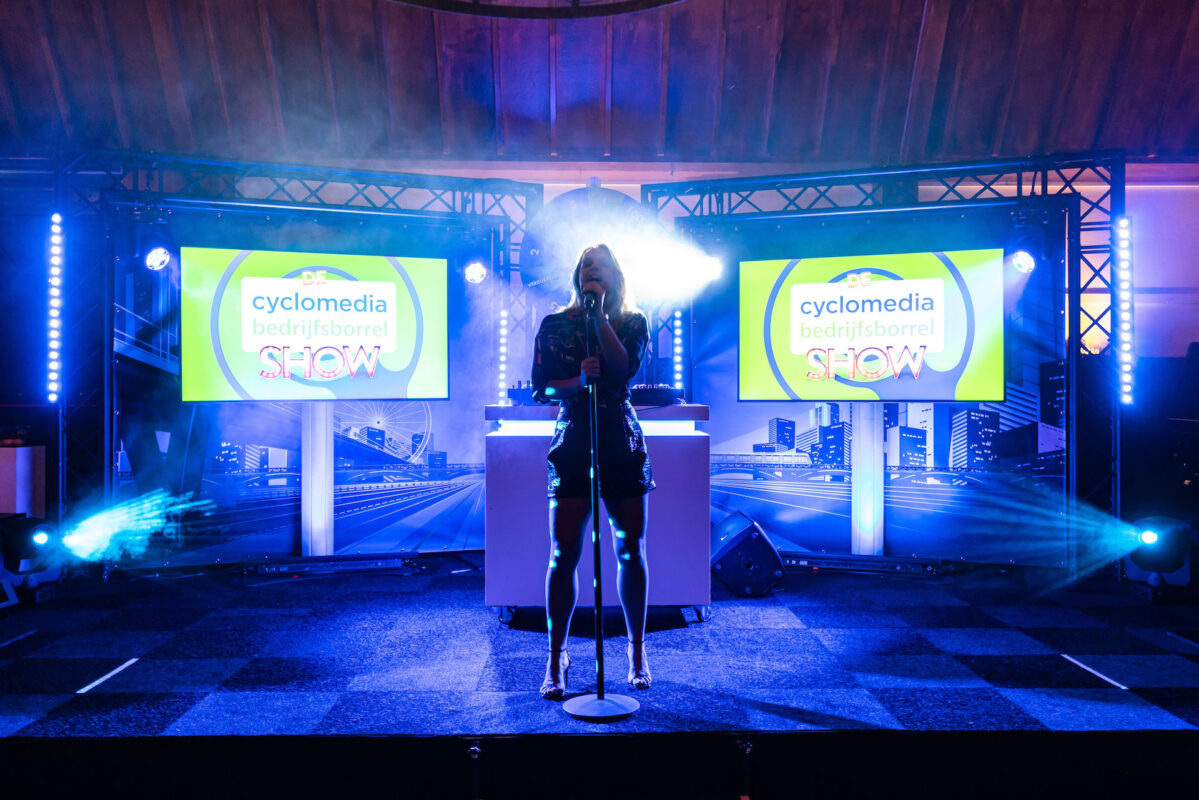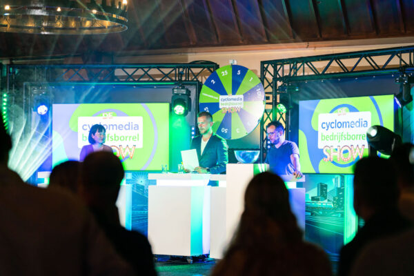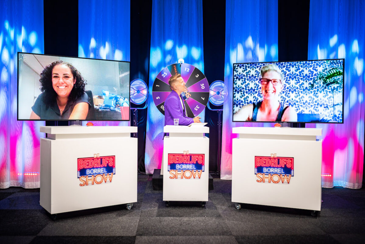 Het is een show, waarin het eerste deel bestaat uit een interactieve pubquiz, waar iedereen kan meespelen met haar eigen mobiel. We nemen een heel decor mee naar jouw locatie óf we spelen hem vanuit de studio.  Na de 2 pubquiz rondes vormen zich 2 teams die vervolgens de “Bedrijfsborrel Show” gaan spelen!